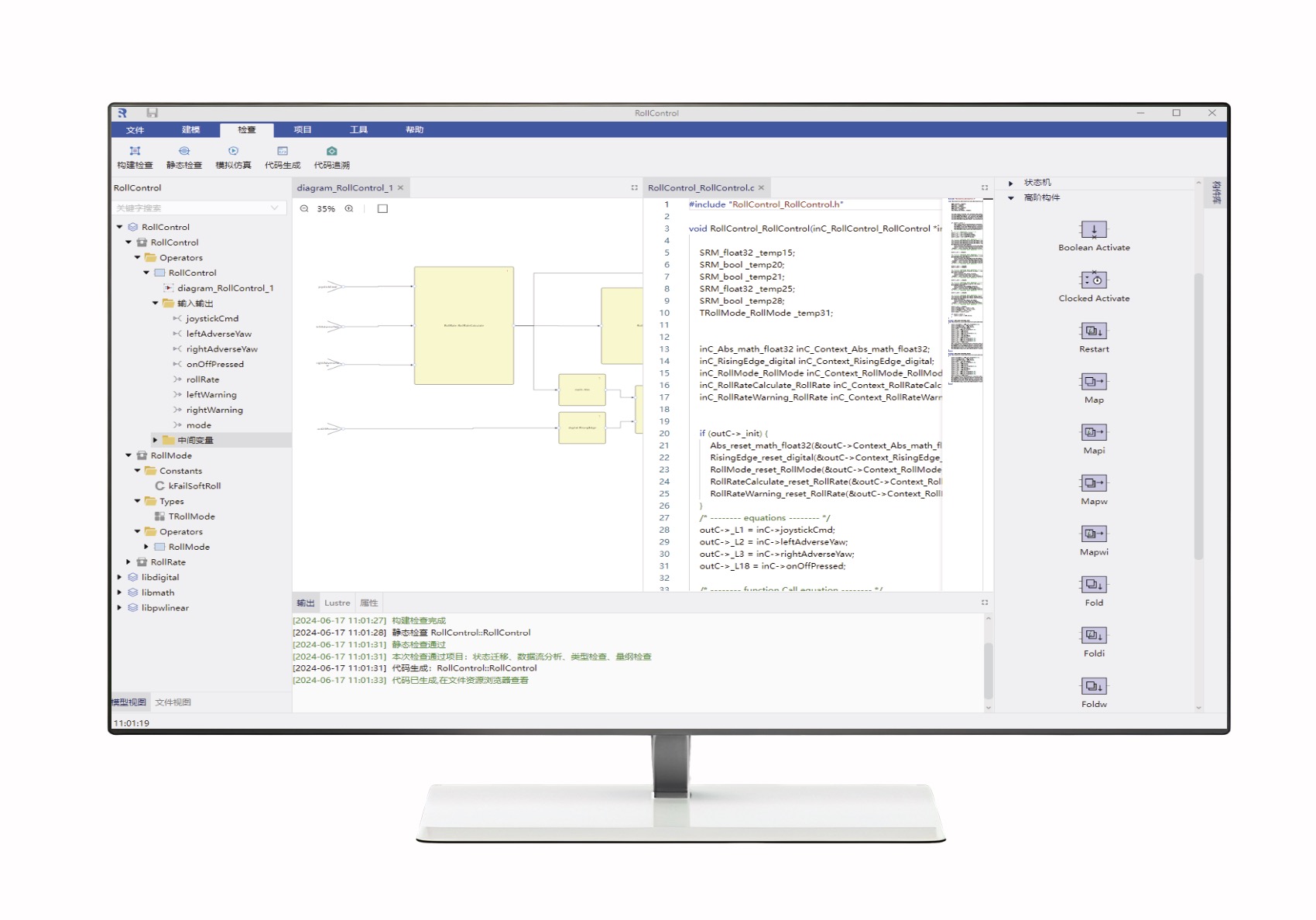 在排除模型早期错误,保障模型一致性、正确性和安全性基础上,通过模型、LUSTRE语言、代码转换,实现C代码自动生成。